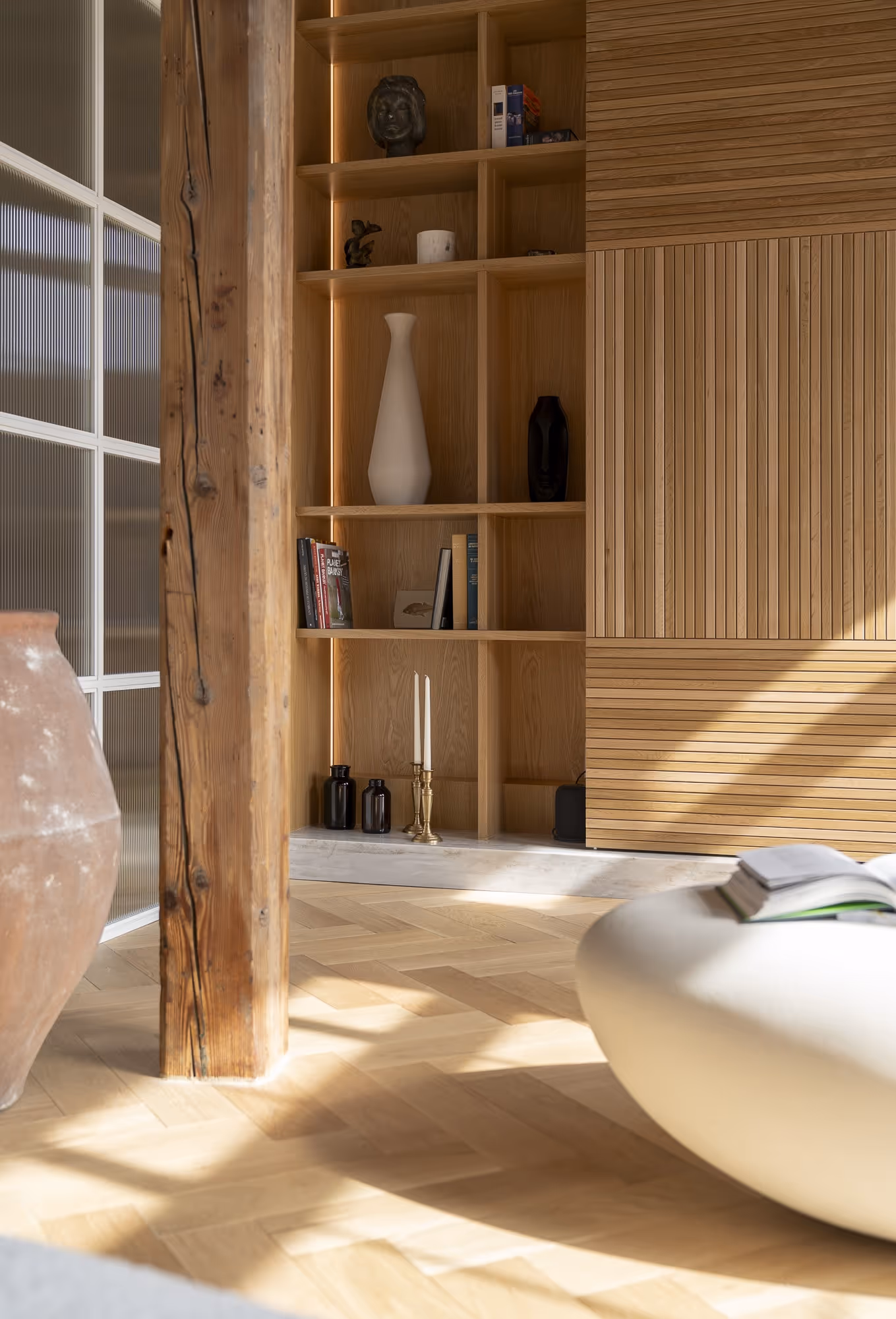 Pour ce projet résidentiel situé dans le quartier Sainte-Cunégonde à Montréal, nous avons déployé des solutions d’ébénisterie architecturale intégrées utilisant le chêne blanc sous toutes ses formes et une finition laque opaque. Travaillant directement à partir du design conçu par les clients, notre rôle a consisté en un développement technique rigoureux et une fabrication minutieuse. Le résultat est une maîtrise complète de l’environnement intérieur, où le mobilier devient une composante essentielle et fluide de l’espace de vie.